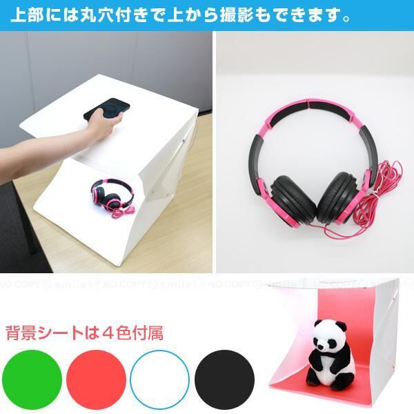 フリマアプリの出品・ハンドメイド作品の撮影・ブログやSNSの投稿などに、誰でも簡単に明るくきれいな写真が取れるミニスタジオ。背景シートは4色付属で真上からの撮影にも対応(脱着可能なフタ付き)。140灯 LEDライトを搭載。